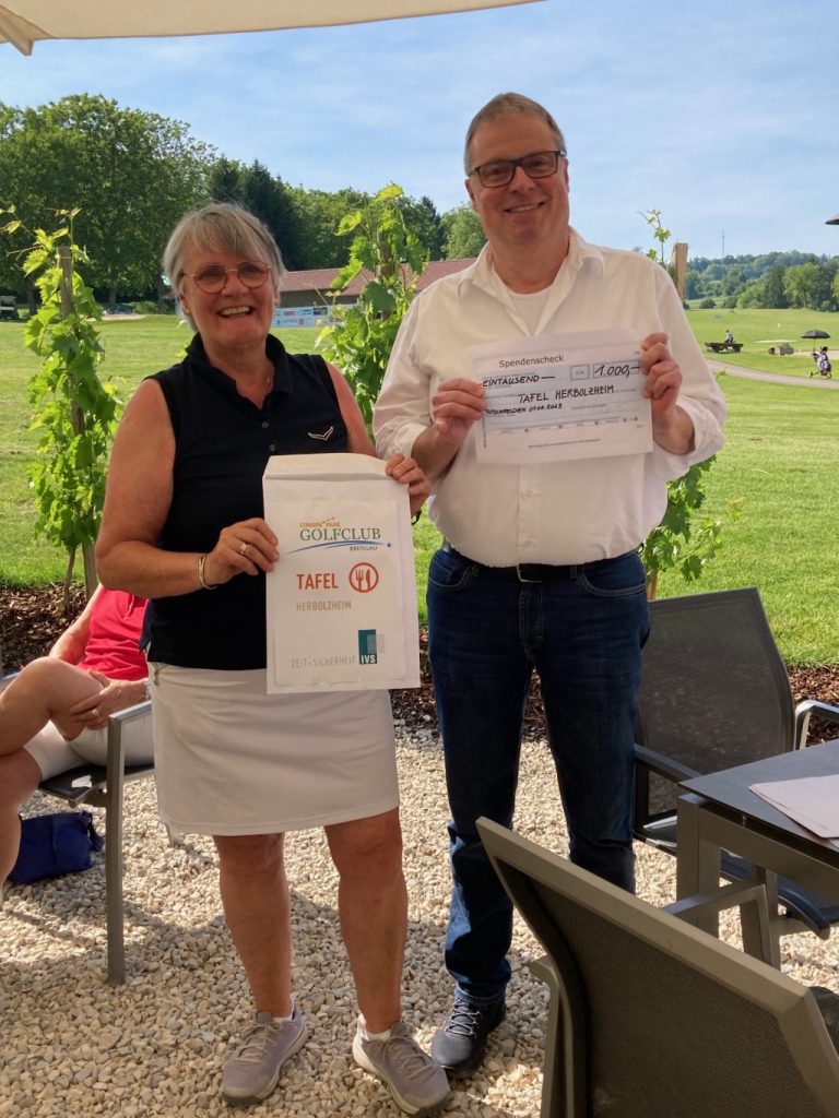 Die Seniors Captain Johanna Kühn konnte dem Vorstand der Tafel Herbolzheim e.V., Herrn Christoph Bilic, einen Scheck in Höhe 1000.- Euro überreichen. Dieser stellte sich aus den Startgeldern und von privaten Sponsoren zusammen. Anschließend wurde der Betrag von der Firma IVS Zeit + Sicherheit GmbH auf die oben genannte Summe aufrundeten. Dank geht auch an den Golfclub Breisgau, der auf die Spielgebühr verzichtete.