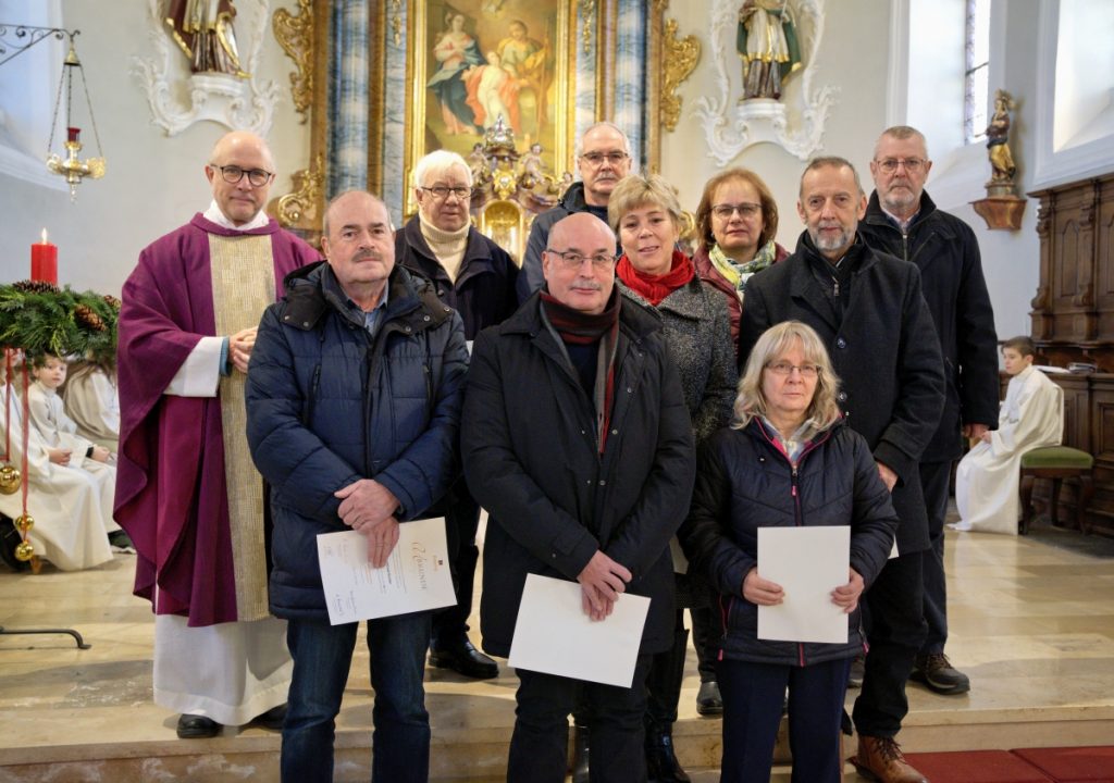 Die geehrten Mitglieder mit Pfarrer Bernhard Schneider: (links) und dem Vorsitzenden Lothar Herb (rechts), welcher die Ehrungen vornahm.