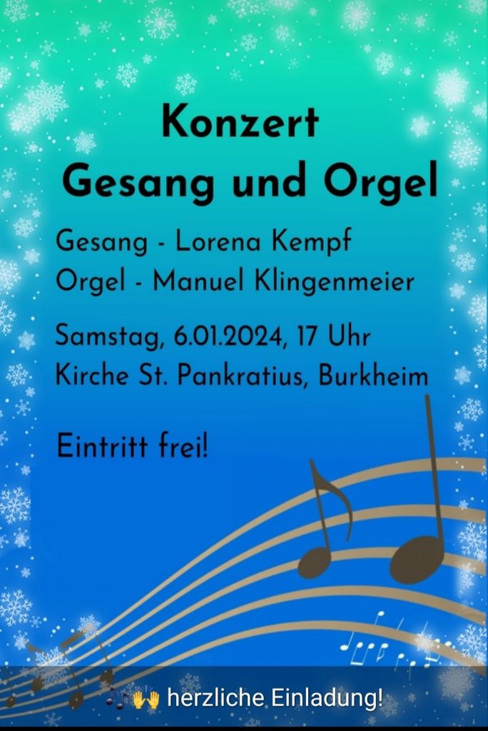 Am Abend des Dreikönigstags, den 6. Januar 2024 um 17.00 Uhr, findet in der Pfarrkirche Sankt Pankratius in Burkheim ein Konzert für Gesang und Orgel statt. Die Sopranistin Lorena Kempf und der aus Oberrotweil stammende Kirchenmusiker Manuel Klingenmeier, die beide an der Musikhochschule in Freiburg studieren, bieten ein vielfältiges klassisches Programm unterschiedlicher Epochen mit Komponisten wie Bach, Mozart, Mendelssohn, Saint-Saens und Schubert.