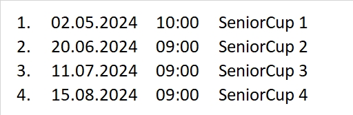 Seniors Cup 2024 Termine 2024 Die Serie ist abgeschlossen. 2024 nahmen 34 Golferinnen und Golfer an den vier Turniertagen teil, davon 23 Herren und 11 Damen. Brutto Netto < zurück
